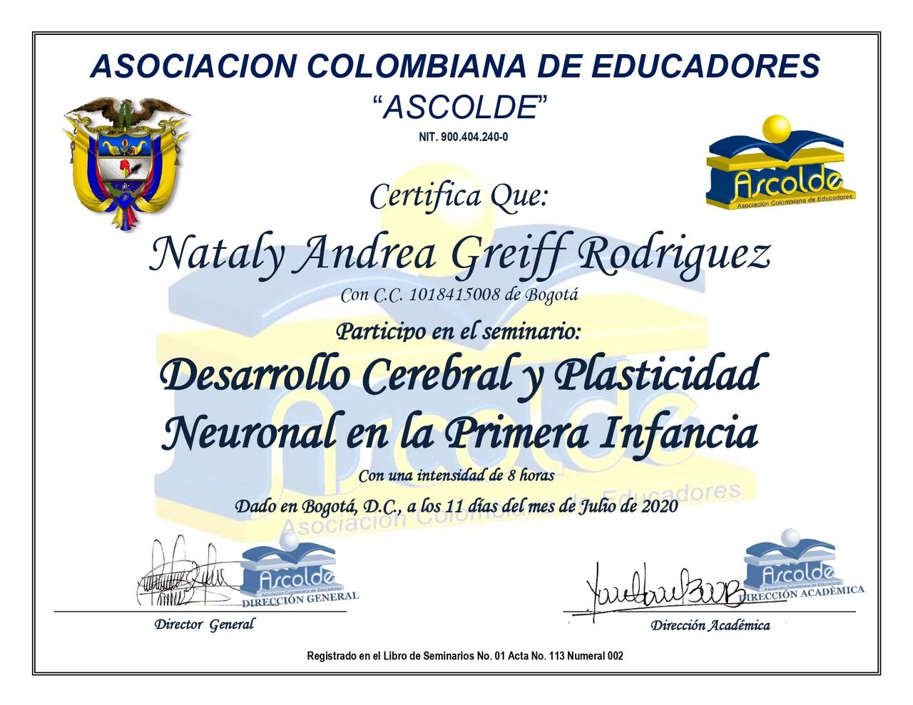 - Diplomado en Ascolde en desarrollo cerebral y plasticidad neuronal en la primera infancia (Bogota-2020)